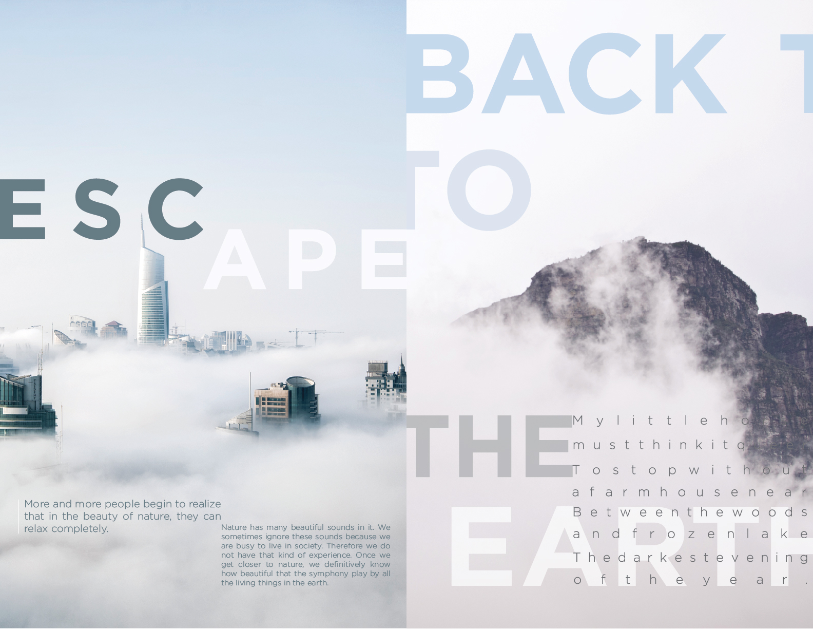 The project "Back to the Earth" is a creative endeavor that explores and visually articulates a lifestyle aimed at reconnecting individuals with the simplicity and tranquility of nature. In response to the challenges faced by city dwellers who often find themselves immersed in the fast-paced urban life, this project advocates for a deliberate step back from the crowd.